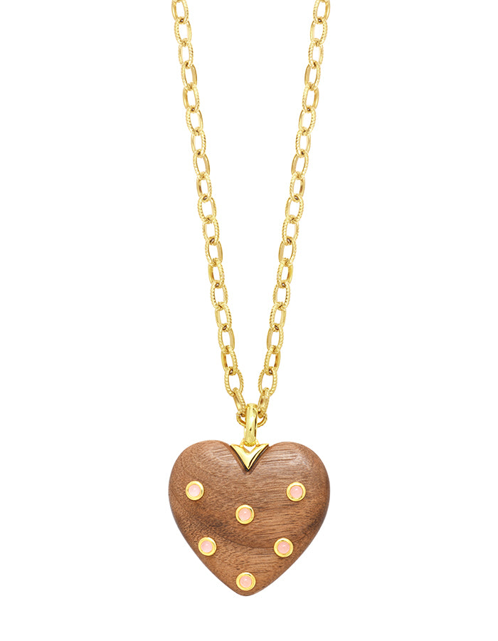 Sautoir cœur bois quartz rose